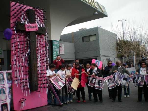 on International Womens Day, and pink crosses placed near a lot in Lomas de Poleo