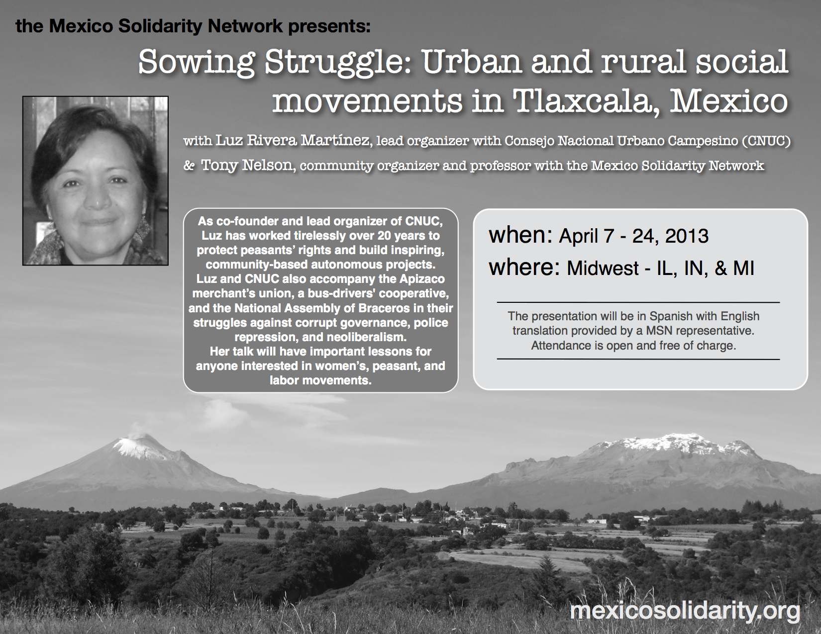 April 6 - 20 (Midwest: IL, IN, MI): "Sowing Struggle: Urban and rural social movements in Tlaxcala, Mexico" with Luz Rivera Martínez, lead organizer with Consejo Nacional Urbano Campesino (CNUC). Luz will speak about her 20 years of experience constructing autonomy, organizing outside the electoral system, and resisting harmful agricultural practices such as using GMO seeds and chemical fertilizers. Luz is an amazingly inspiring speaker with a wealth of experience, and her talk will have important lessons for anyone interested in women's, peasant, and labor movements. [download flyer]